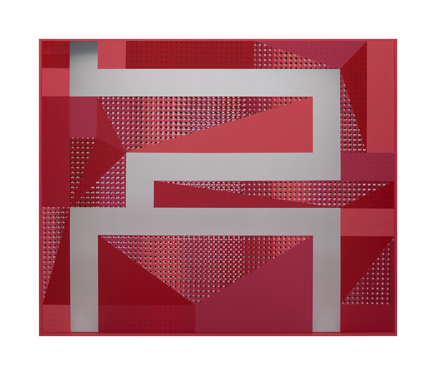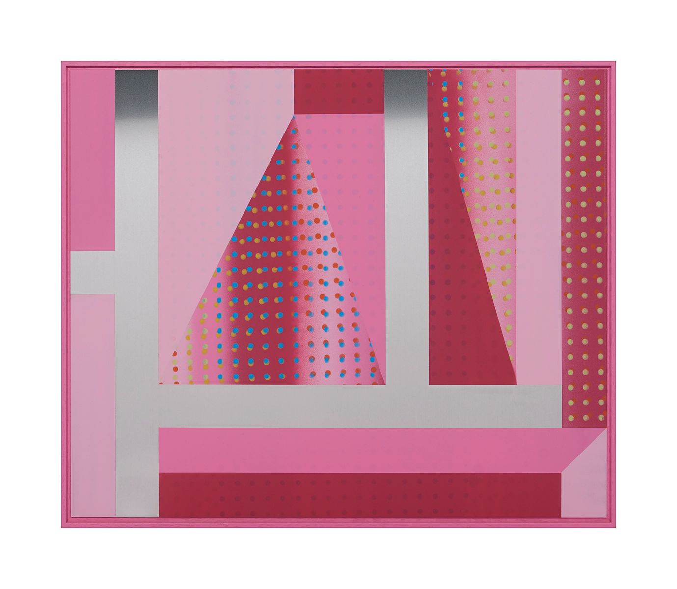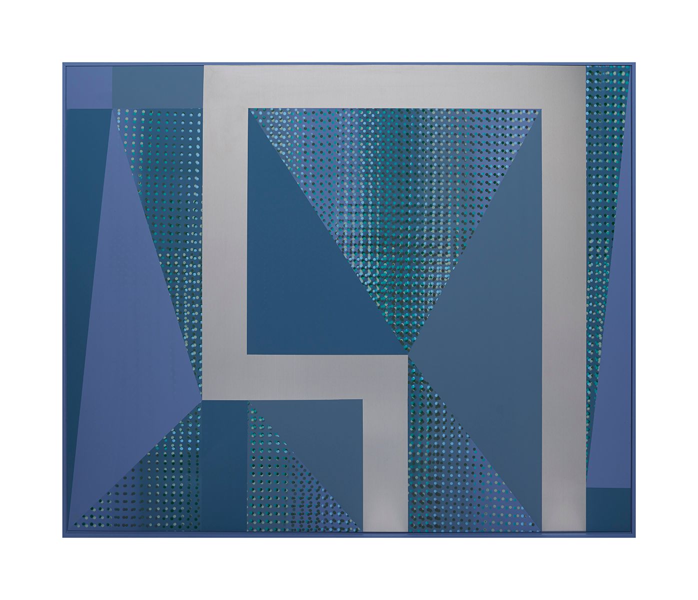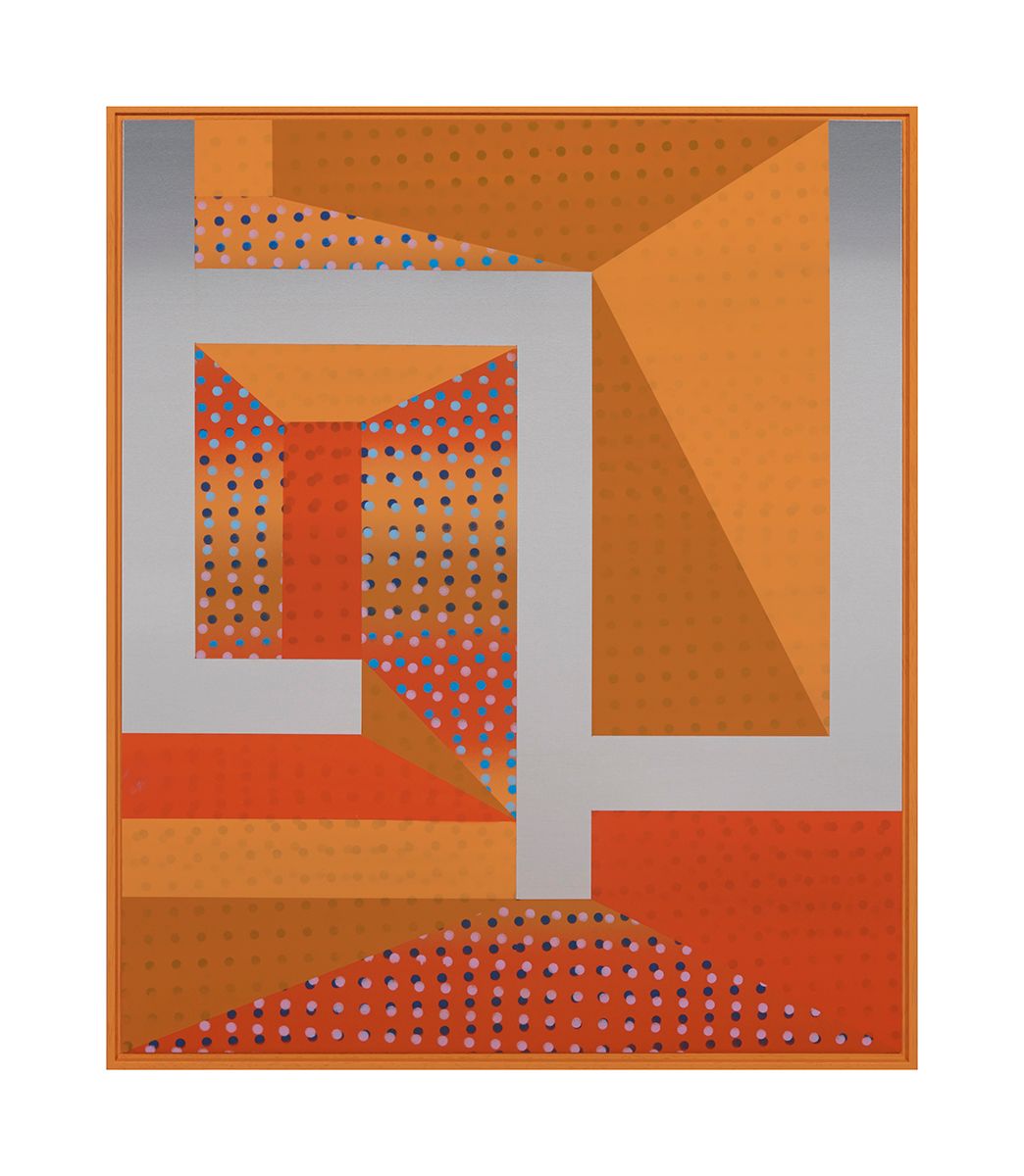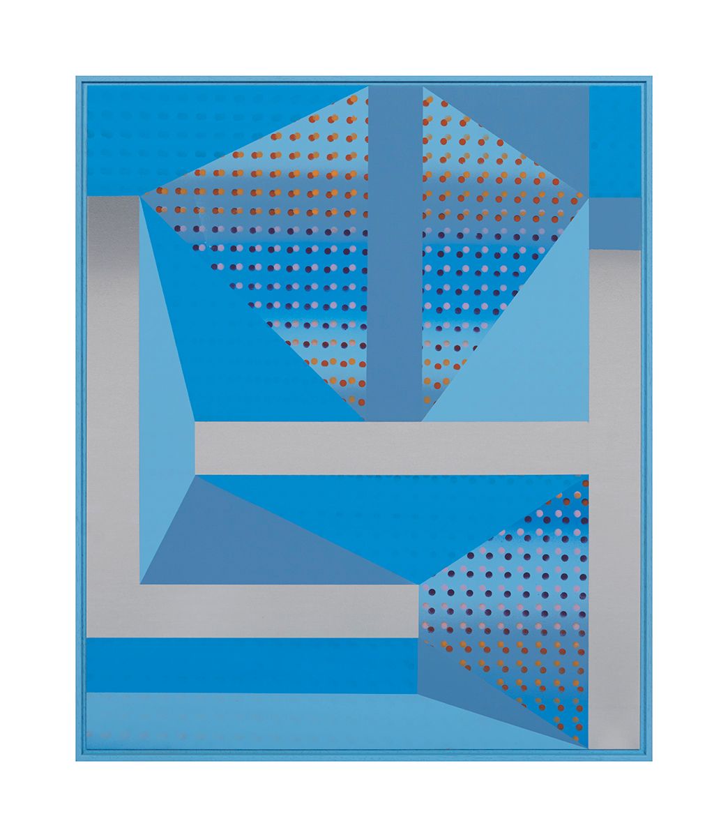 Across the flat surfaces of the paintings Cooke has placed intersecting dots, which merge in and out of registration, producing a throbbing, ‘wave-like’ aura that suggests musical rhythm and beats, allowing us to almost ‘hear’ the pictures. These dots seem to hover just under the surface and they activate the spaces within each work, so that we are able to float down inside the various planes within.